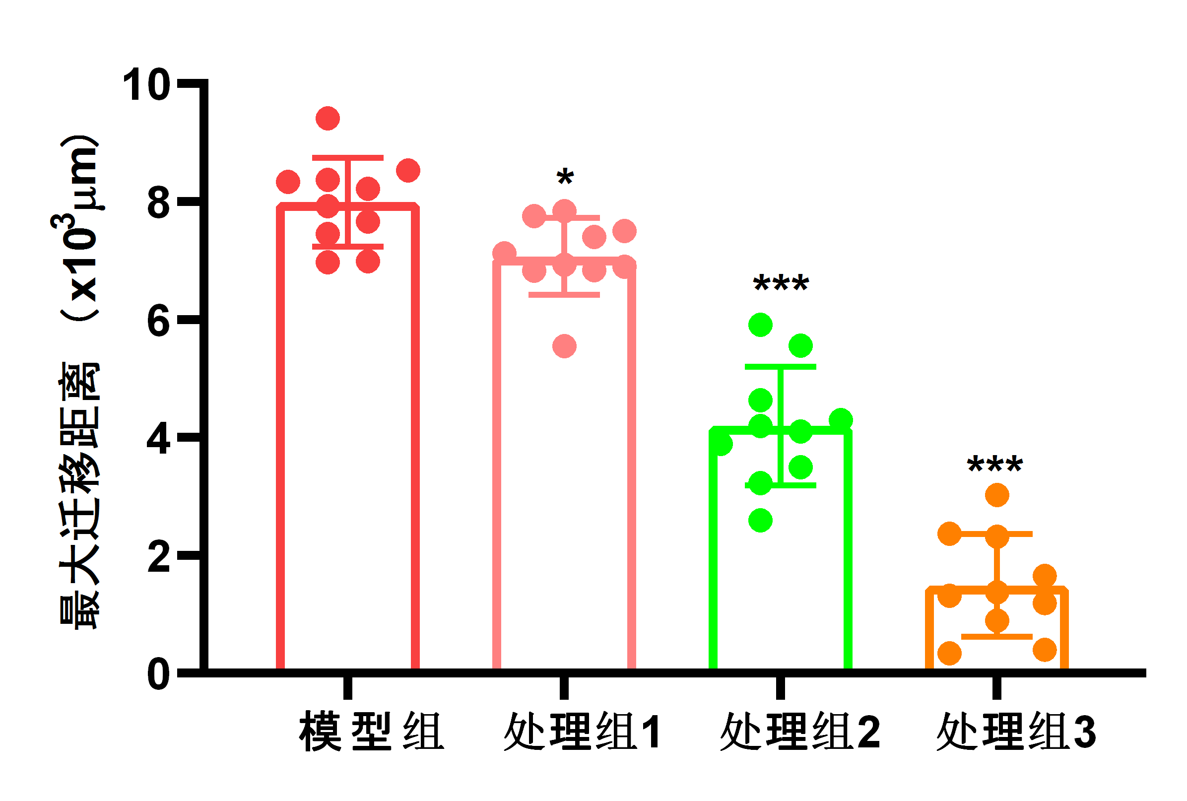 03.不同肿瘤细胞或同种肿瘤细胞不同药物处理在斑马鱼体内迁移比较