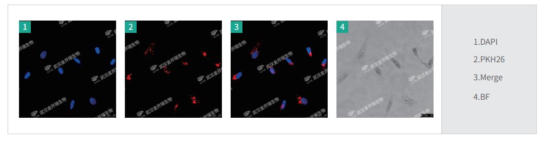 荧光染料PKH26是可对活细胞进行荧光标记的新型染料,可以标记活体细胞,通过与膜结构的脂质分子结合而标记细胞。对细胞毒性较小,荧光背景低,脂溶性高,能够轻易穿透细胞膜,有着强而稳定的红色荧光。经PKH26标记的细胞可用于体外和体内增殖研究,且具有不会使邻近细胞染色的功能。还可用于外泌体的标记染色实验,监测细胞吞噬作用。
